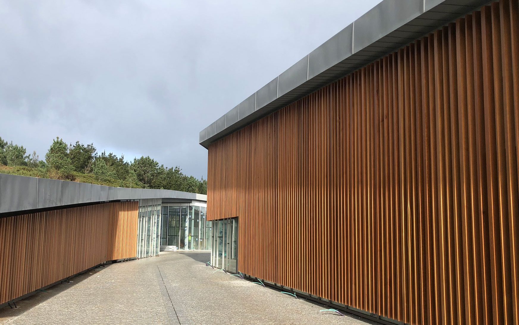 Le bois et le design de Candame, la marque contract du groupe Aluman, accueillent les voyageurs qui font escale au Parador de la Costa da Morte, à Muxía (La Corogne, Galice). L'entrée principale du complexe les accueille avec de grands treillis en bois de cèdre. C'est le prélude à un bâtiment en contact avec le paysage, où prédominent les matériaux simples, aux lignes pures et aux textures naturelles, cherchant à dialoguer avec l'environnement.